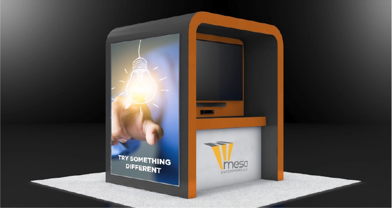 MESA has developed a 1, 2, 3, and 4-user digital kiosks. MESA’s 1-user kiosk is built with a 24 square foot space without the interactive window and 96 square foot space with the interactive window. The multiple user kiosks have a larger footprint and utilize between 41.52-56.52 square feet depending on the configuration. For these larger configurations, 9 feet must be added to every side that contains an interactive digital signs.